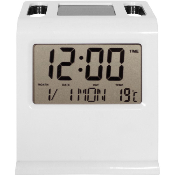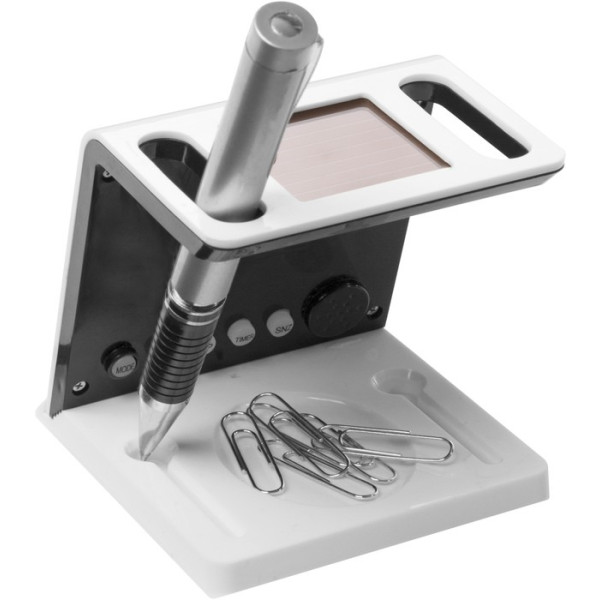 Plástico. Reloj solar y porta lápices. Reloj, alarma, temporizador, fecha, día y temperatura. Sin la luz solar cambia automaticamente y funciona con una batería botón. Dos compartimentos para boligrafos y espacio imantado para guardar clips. Se convierte en tarjetero cuando se desmonta el reloj.