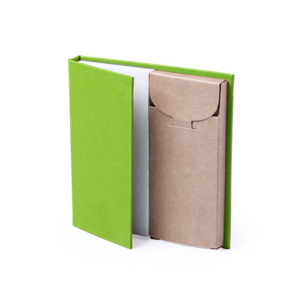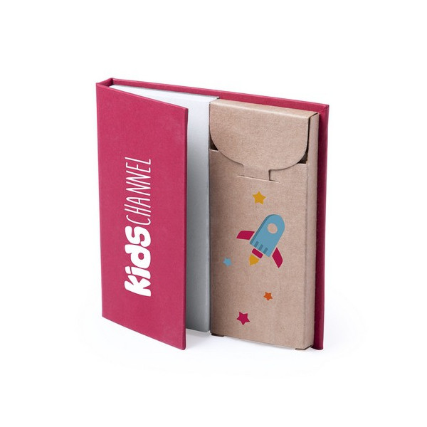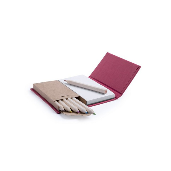 Set de bloc de notas con caja de lápices. Incluye bloc de notas de 60 hojas lisas y 6 lápices de madera en caja de cartón reciclado. Disponible en variada gama de colores.