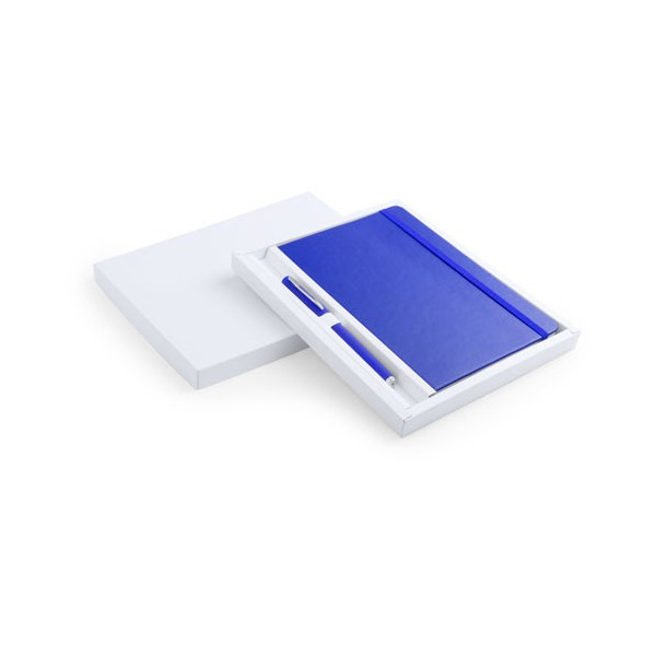 Set de bloc de notas con tapas de suave tacto acabadas en polipiel y bolígrafo de suave cuerpo a juego. De 100 hojas lisas con elástico de sujeción y marcapáginas de tela a juego. Presentado en elegante estuche de cartón blanco troquelado. Bolígrafo en tinta azul.