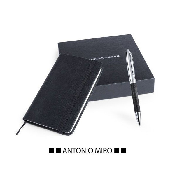 Set de Antonio Miró con bloc de notas de tapas de tacto granulado acabadas en polipiel y bolígrafo metálico de cuerpo en polipiel granulada a juego. De 100 hojas lisas con elástico de sujeción y marcapáginas de tela a juego. Presentado en elegante estuche de cartón de tacto granulado y con suave espuma troquelada. Bolígrafo en tinta azul.