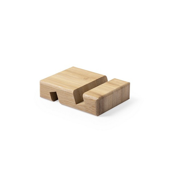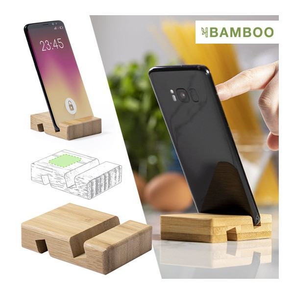 Soporte de línea nature para dispositivos móviles (smartphones y tablets). Fabricado en resistente bambú de acabado lacado, con ranura/soporte en ambas caras.