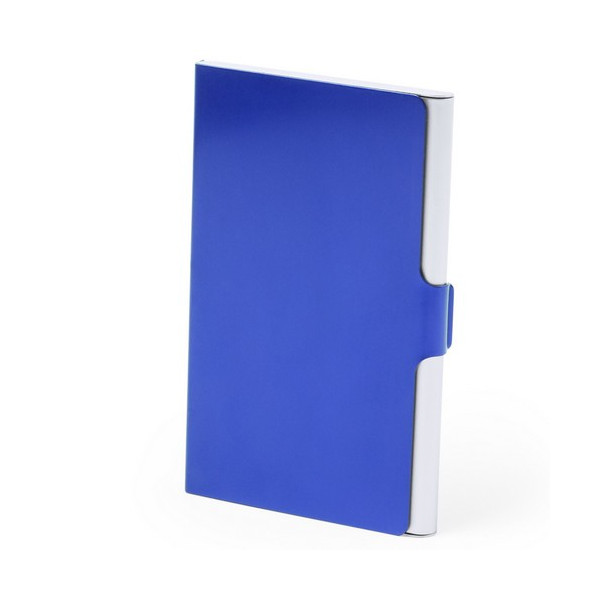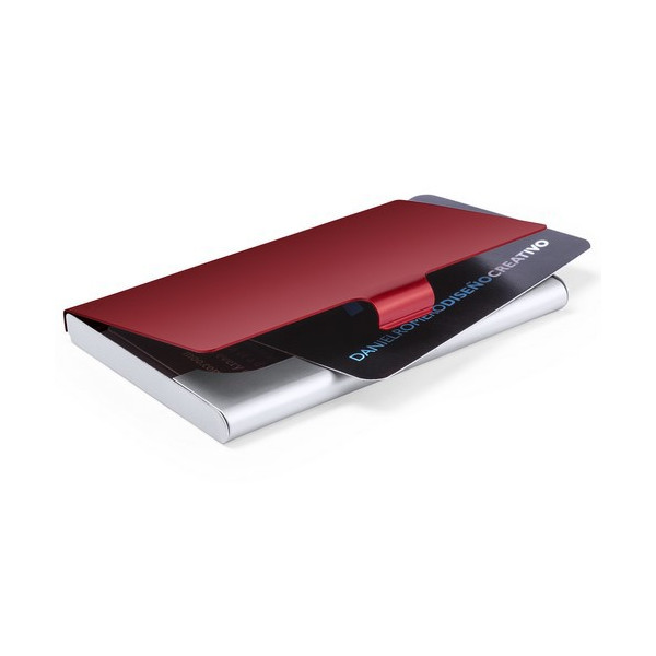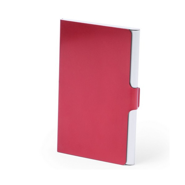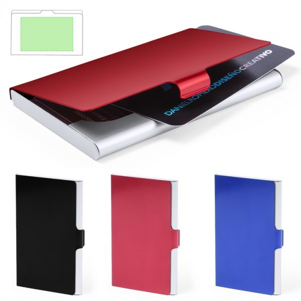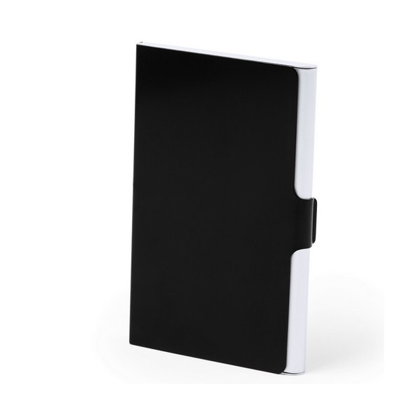Tarjetero bicolor de aluminio con sistema de cierre a presión.