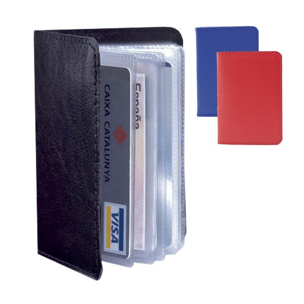 Tarjetero con cuerpo en suave acabado en polipiel de acabado brillante en llamativos colores y con 12 compartimentos interiores en resistente PVC transparente.