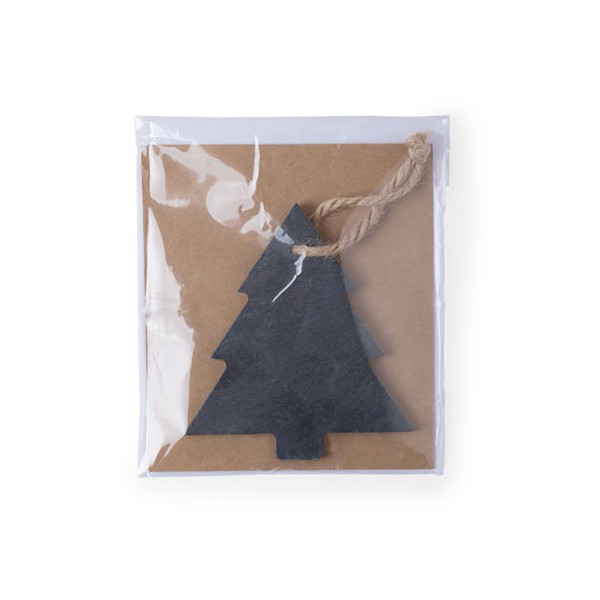 Adorno navideño en pizarra con diseño de árbol y estrella.