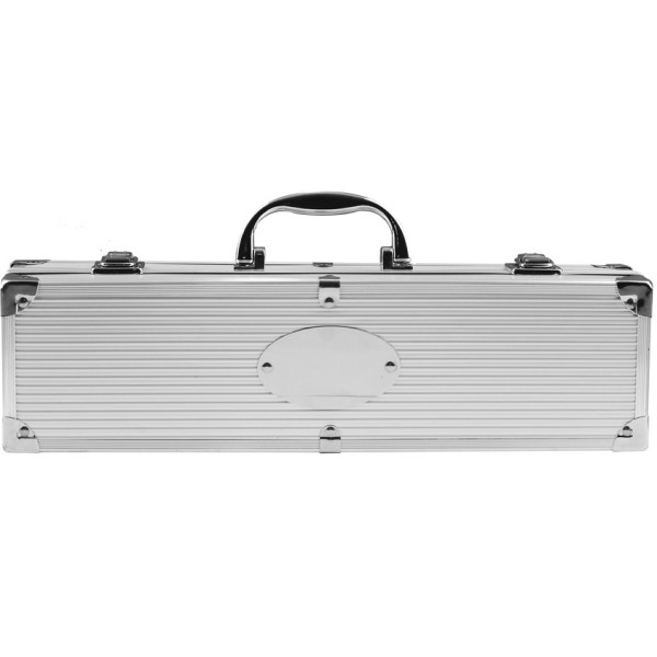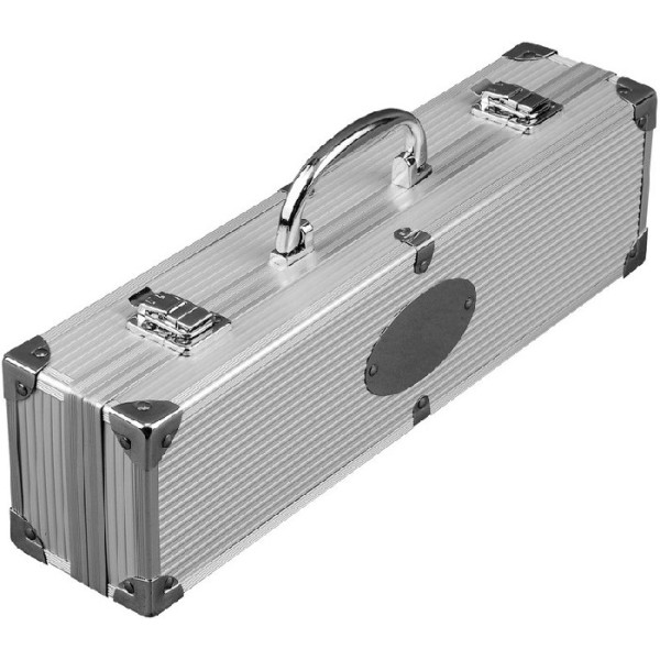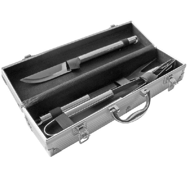 Set de 3 piezas de acero inoxidable. Caja contenedora de aluminio. Con manija para transportar. Apertura completa.