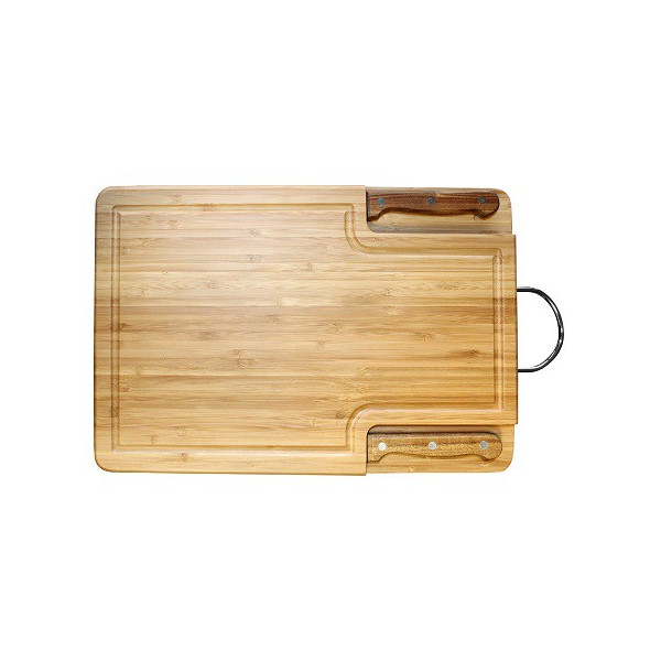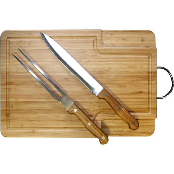 Madera. Set de parrilla con tabla, cuchilla, tenedor asador y manilla.