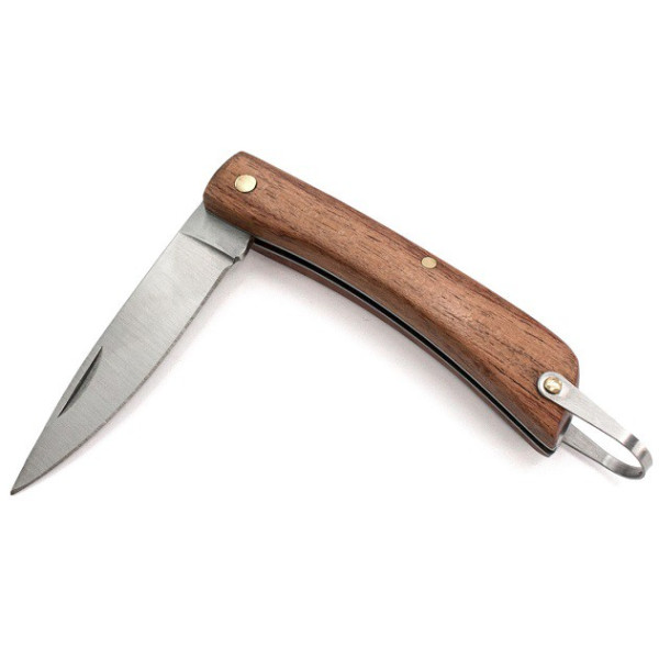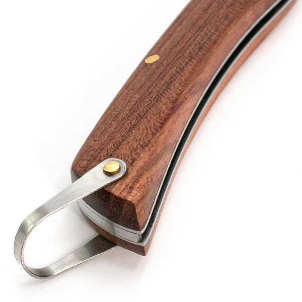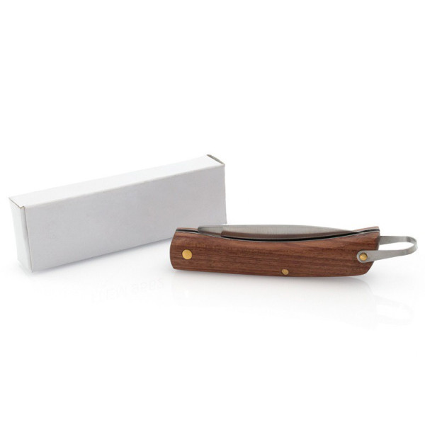 Navaja con hoja en acero inox y empuñadura en madera natural con accesorio de ajuste.