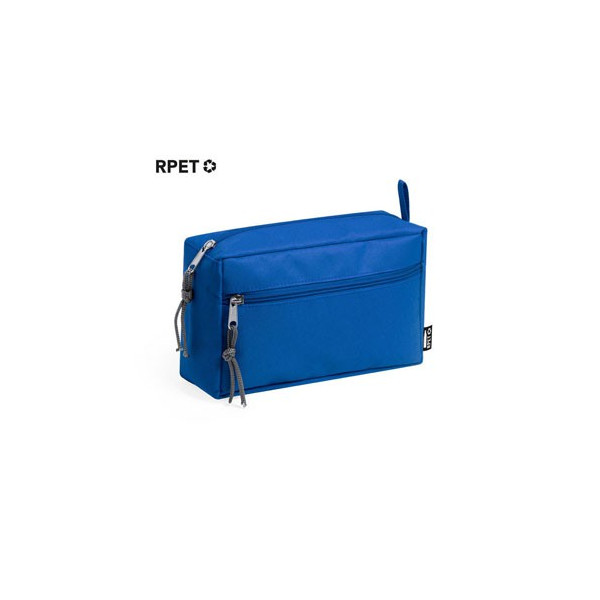 Neceser de línea nature en RPET, elaborado a partir de plástico reciclado, para así fomentar la reutilización de residuos plásticos y ayudar a la sostenibilidad del planeta. Compartimento principal y bolsillo frontal con cierre de cremallera, con cintas en tiradores para cómoda apertura. Asa de transporte a juego y distintivo RPET en etiqueta lateral. Disponible en variada gama de colores.