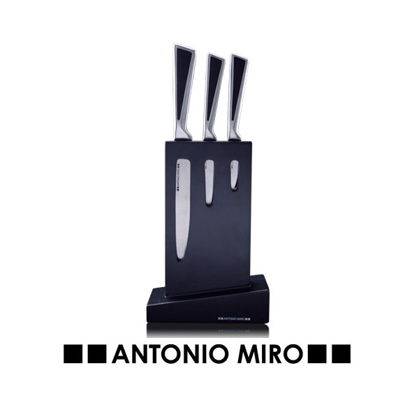Tacoma de Antonio Miró con 3 cuchillos de acero inox en elegante diseño minimalista. Con logotipo de la marca en hojas y presentados en resistente soporte troquelado con logotipo de la marca y en estuche individual.