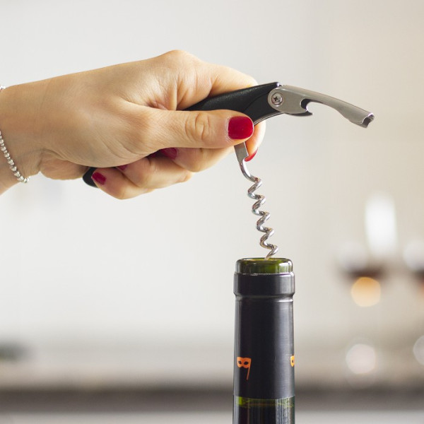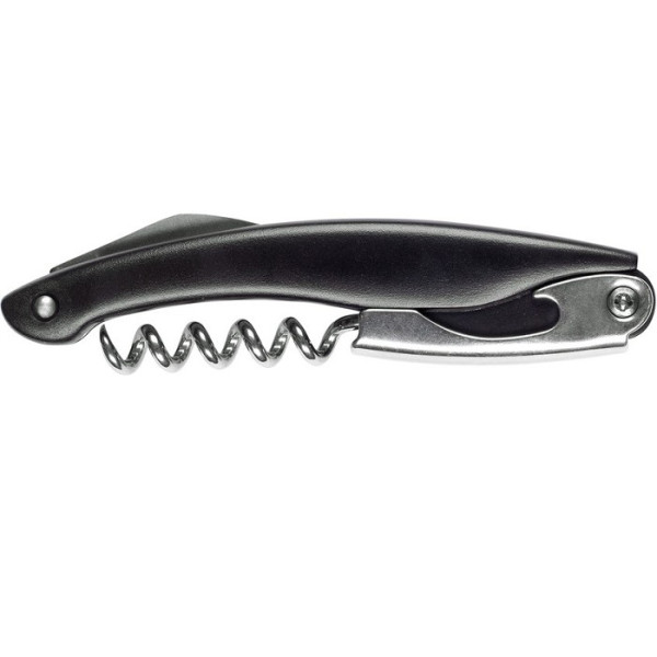 Plástico y acero. Sacacorcho, destapador para botellas y navaja.