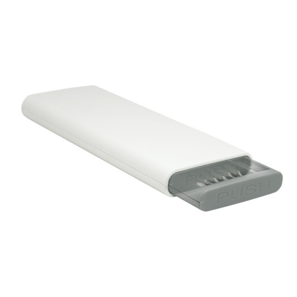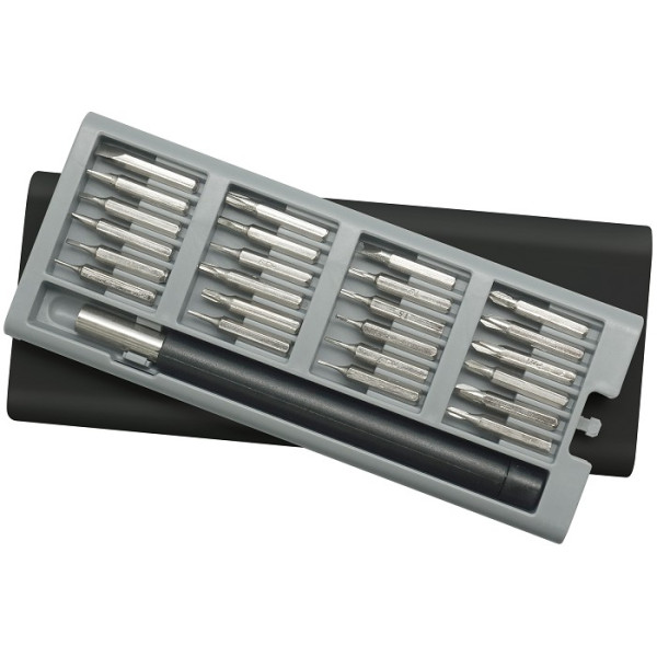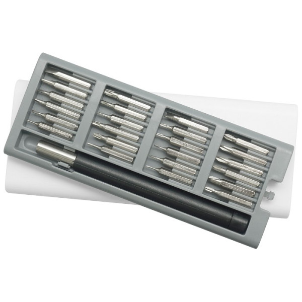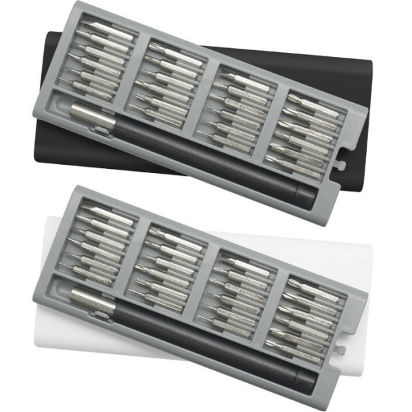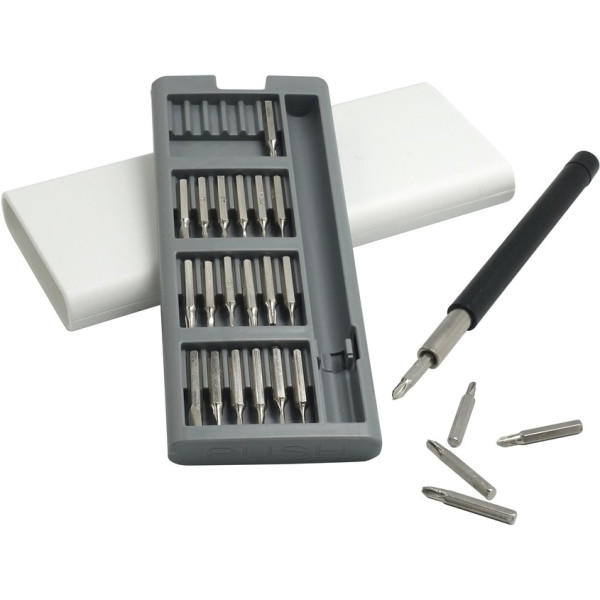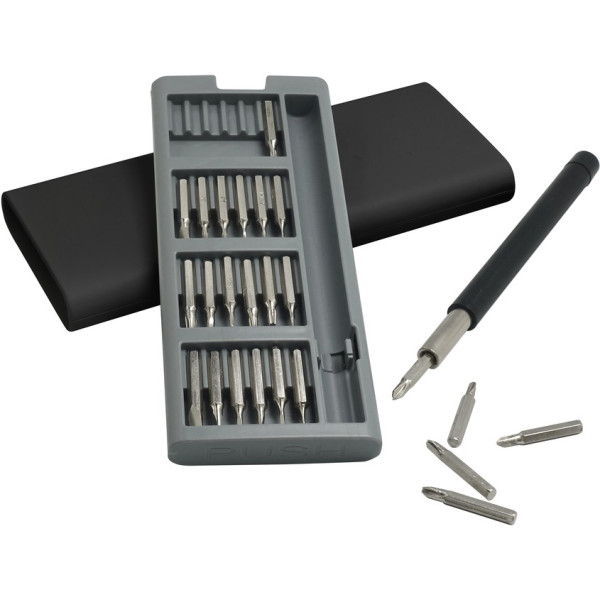 Plástico y Acero. Mango con punta imantada con 24 puntas diferentes. La caja viene con cuatro compartimentos imantados que permiten mantener ordenadas las diferentes puntas. La caja contiene apertura push.