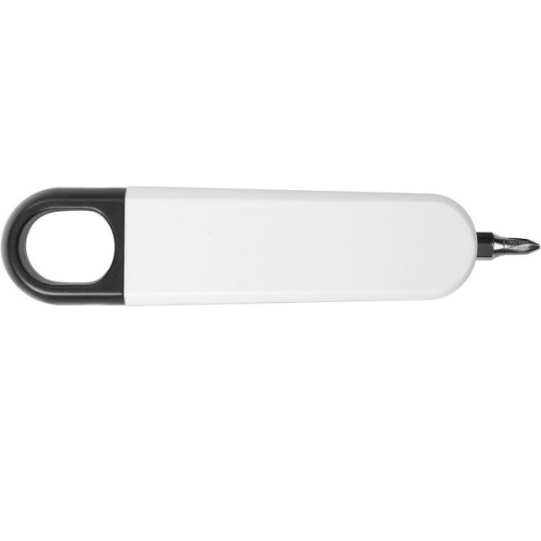 Plástico. Herramienta destornillador con 4 puntas intercambiables que se guardan en el interior. El extremo de la tapa es imantado para el ajuste de las puntas.