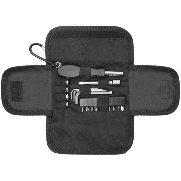 Acero y plástico. Set de herramientas de 19 piezas. Destornillador con 10 puntas diferentes, 3 llaves Allen, 4 llaves tubo de 4 medidas y alargue. Estuche con cierre de velcro y gancho.