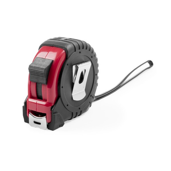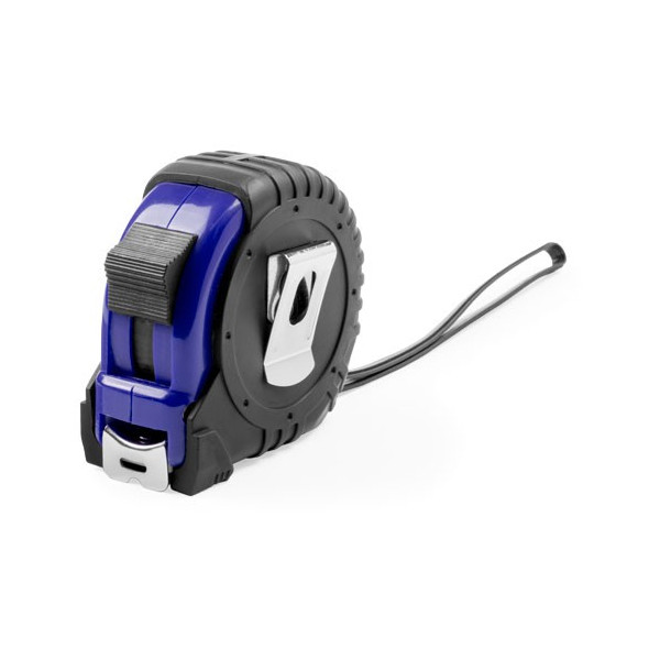 Huincha de medir de 5 metros con cuchilla metálica y mecanismo de bloqueo. Con cuerpo de suave acabado en variados colores, recubierto con funda protectora de resistente goma, clip metálico para cinturón y cinta de transporte. Con troquelado especial para marcaje en doming/gota de resina y presentado en caja individual.