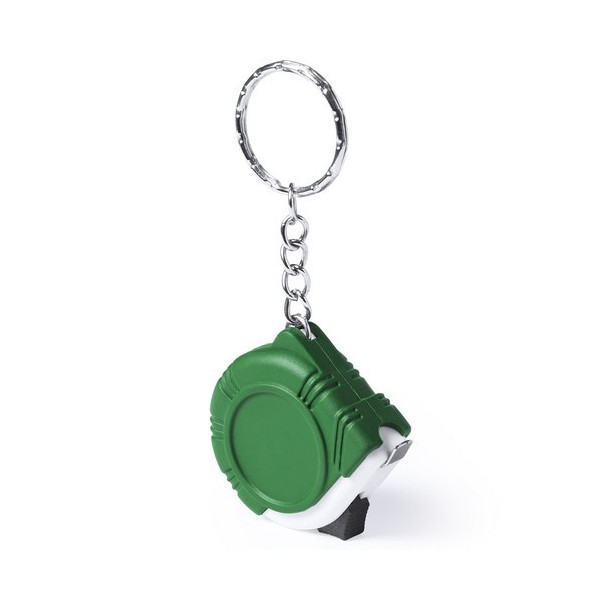 Huincha de medir llavero de 1 metro con cuchilla metálica y mecanismo de bloqueo. Medidas en centímetros, pulgadas y pies. Con troquelado especial para marcaje.