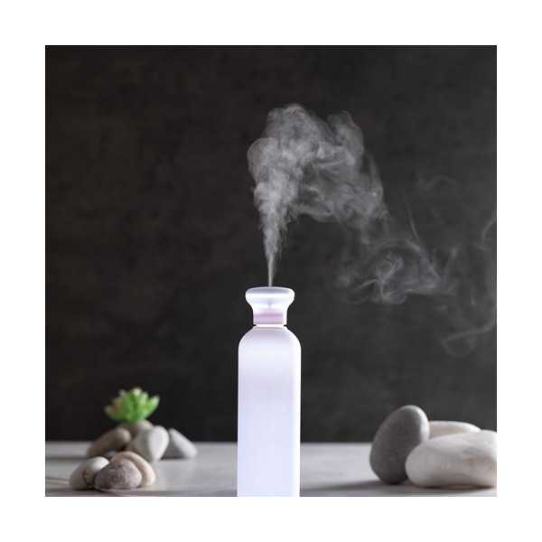 Elegante y decorativo humidificador con original diseño, disponible en acabado blanco y difuminado. Con suave tacto de goma y luz led blanca en el interior. 250ml de capacidad, con botón de encendido ON/OFF. Recomendado para uso en estancias de hasta 25m2, con 3 filtros de recambio y cable de alimentación USB (incluido). Presentado en bandeja protectora de PVC y en atractiva caja de diseño.