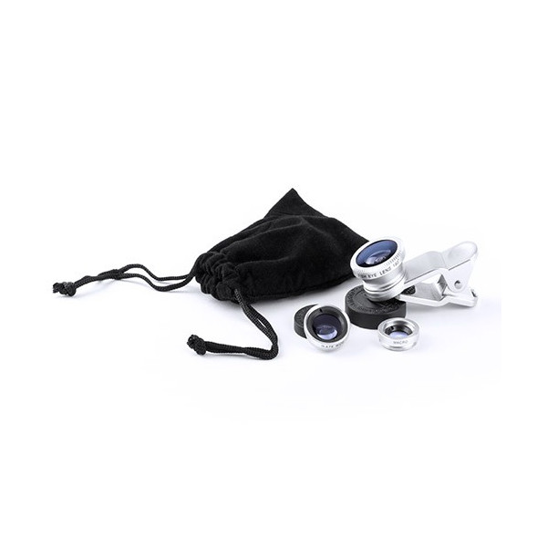 Set de 3 lentes universales para smartphone, ajustables a la cámara mediante pinza. Lentes de aluminio y cristal, con efectos -ojo de pez-,-macro- y -gran angular-, con paño limpiador de microfibra y presentadas en una bolsita de terciopelo con cordones autocierre. Set presentado en atractiva caja de diseño.