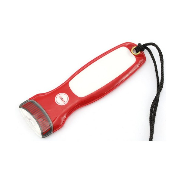 Linterna de 2 ledes de diseño extraplano. Con cuerpo rectangular acabado en PVC de variados y vivos colores. Con cinta de transporte y pilas de botón incluidas.