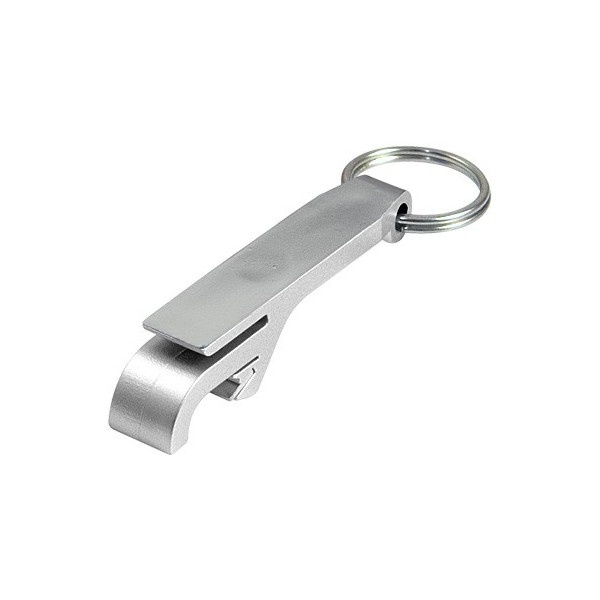 Llavero-Destapador con cuerpo plástico plateado y destapador metálico.