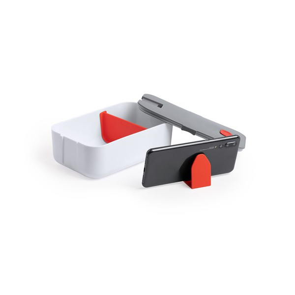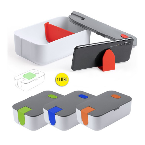 Fiambrera de 1l de capacidad en resistente material PP libre de BPA, en combinación de colores blanco y gris. Con soporte para smartphone integrado en tapa y separador interior móvil.