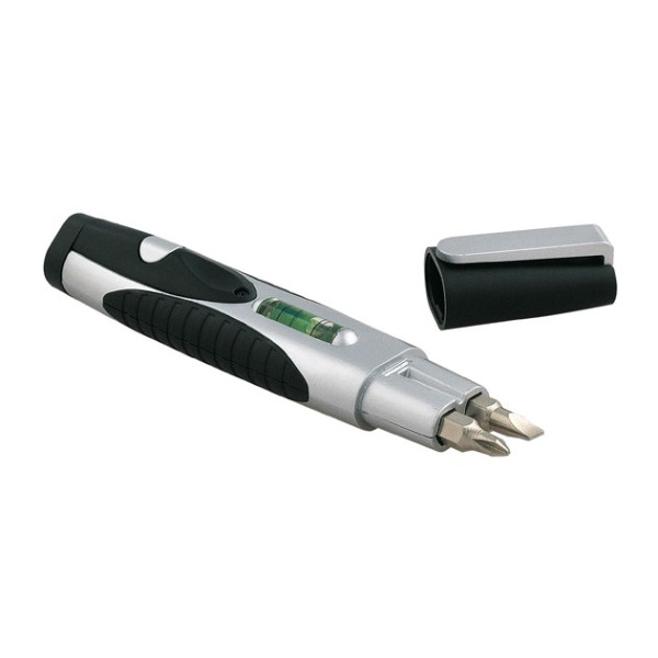 Multiherramienta con resistente cuerpo de acabado anti deslizante con 4 accesorios. Incluye 2 cabezales destornilladores planos y de estrella, nivel integrado en cuerpo y linterna led. Presentada en caja individual. Pilas de botón incluidas.