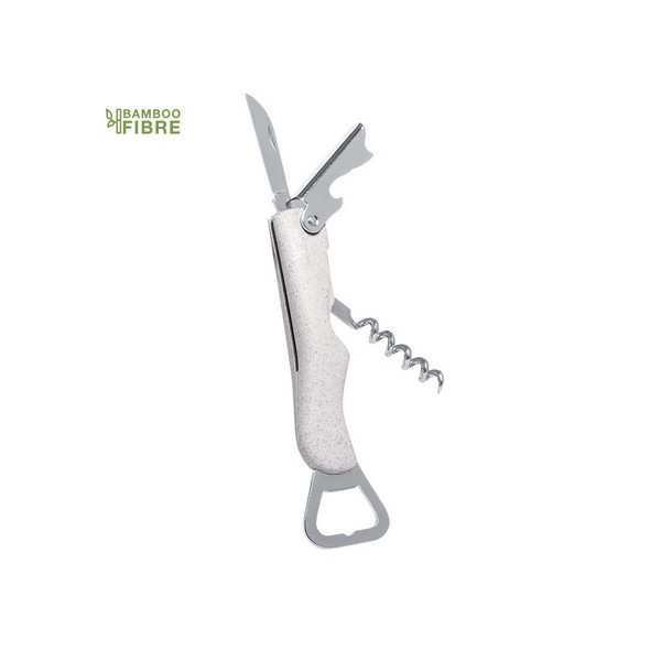 Sacacorchos de línea nature con abridor de botellas y cortacápsulas. Fabricado en fibra de bambú y ABS, con accesorios en acero inox. Presentado en atractiva caja individual de diseño eco.