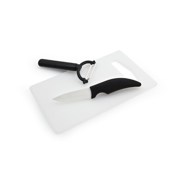 Set de cocina con cuchillo, pelador y tabla. Cuchillo de hoja en cerámica de color blanco y resiste mango ergonómico, pelador con cuchilla inox y resistente tabla con troquelado para fácil manejo. Presentado en caja individual.