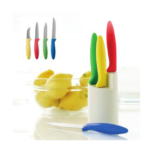 Set de cuchillos de diferentes tamaños con diferentes hojas en acero inox y suave mango ergonómico en alegres tonos. Con resistente soporte y presentados en caja individual.