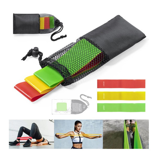 Set de gomas elásticas para los más deportistas. Incluye 3 cintas de 30x5 cm, fabricadas en resistente material TPE y 3 niveles de resistencia: ligera, media y fuerte. Presentado en funda de poliéster con cierre de cordón y accesorio de ajuste.