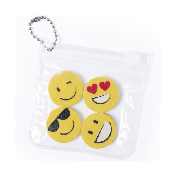 Set de 4 gomas en divertidos diseños emoji y llamativo color amarillo. Presentadas en estuche de PVC transparente con cierre zippery cadenita de transporte.