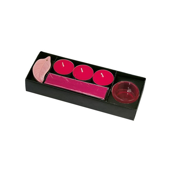 Set de velas e incienso en vivos colores. Incluye quemador de cerámica, barritas de incienso, 3 velas aromáticas y soporte para velas. Disponibles en aromas fresa, y ocean. Presentado en estuche individual con compartimentos independientes y tapa transparente.
