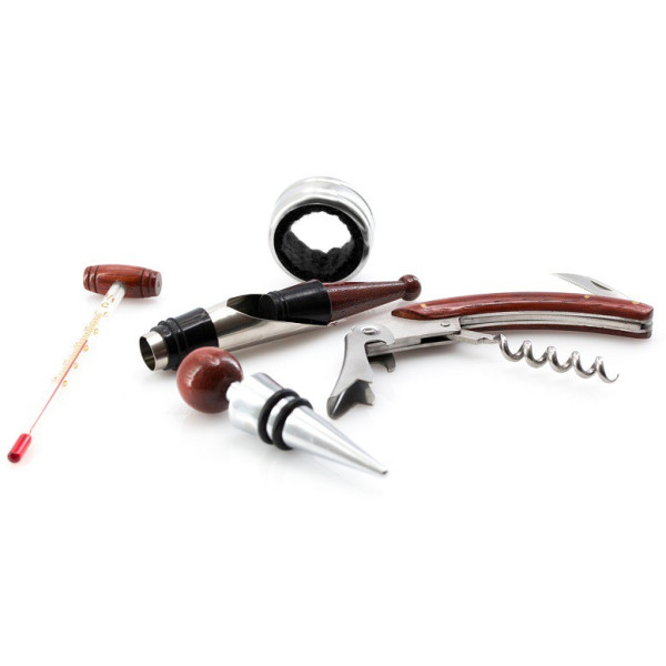 Incluye sacacorchos con cortacápsulas y abridor, tapón, dosificador, recogegotas y termómetro.