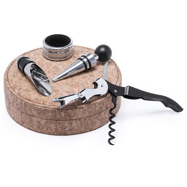 Set de vinos de elegante diseño circular con acabado en corcho natural.