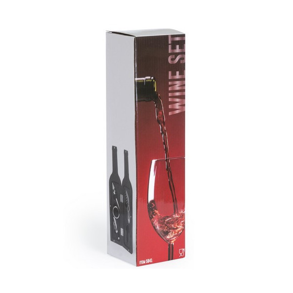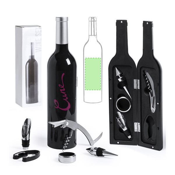 Original set de vinos en forma de botella de vino de acabado brillante, cierre magnético y accesorios de acero inox. Incluye sacacorchos con cortacápsulas y abridor, tapón dosificador y recogegotas. Presentado en estuche individual con interior en suave espuma troquelada.