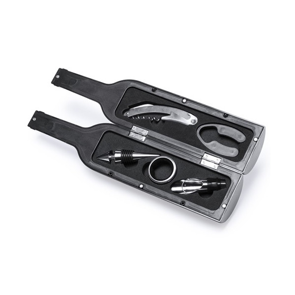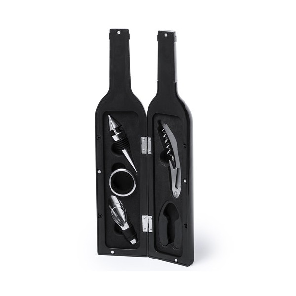 Set de vinos en forma de botella, cierre magnético y accesorios de acero inox.