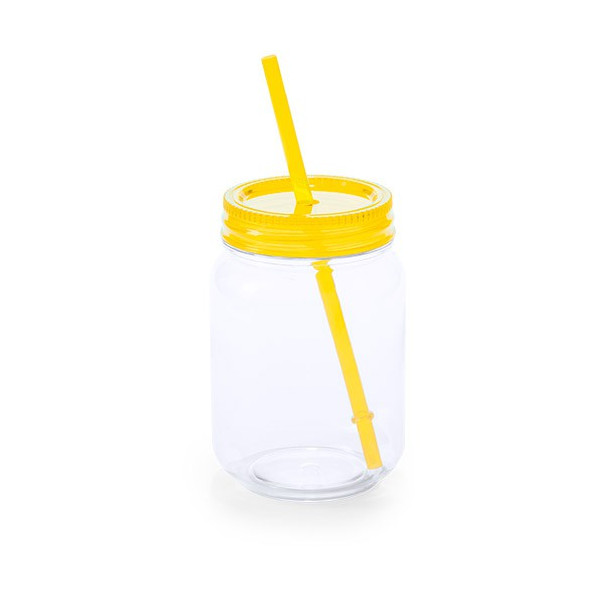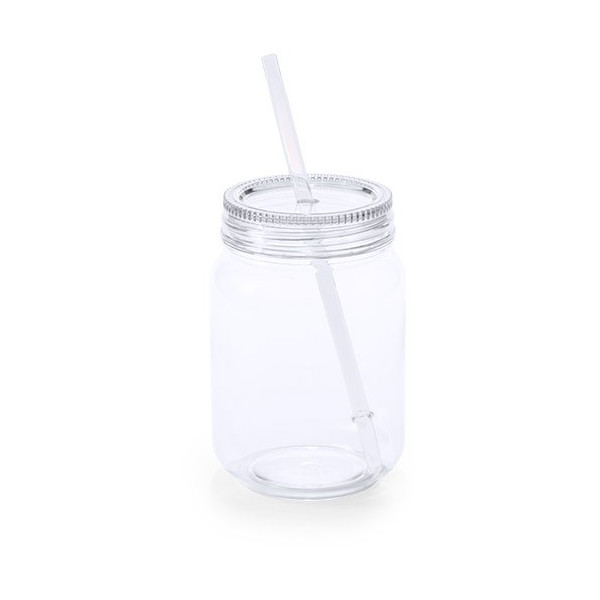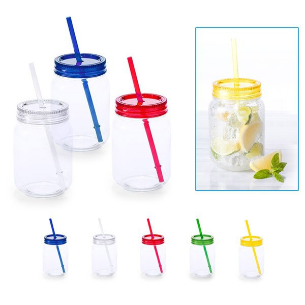 Divertido tarro de PS de 600ml de capacidad con cuerpo en transparente y accesorios en variada gama de vivos colores. Con tapa a rosca y pajita a juego.