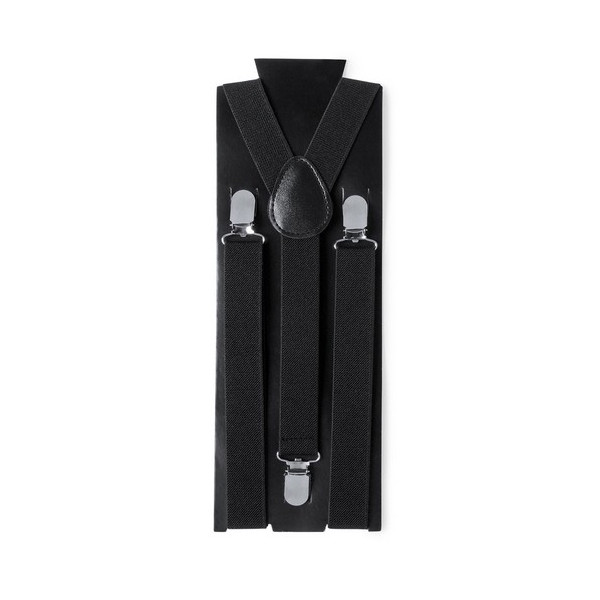 Tirántes elásticos de poliéster en sobrios colores con accesorios metálicos. Con refuerzo de polipiel en espalda a juego y presentados en original cartulina individual de color negro.