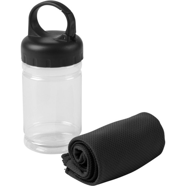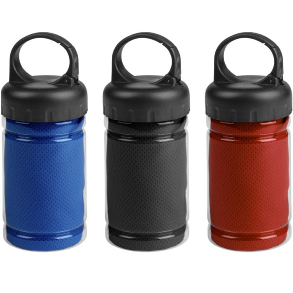 Políester. Toalla de enfriamiento en un estuche de plástico transparente. Para un efecto refrescante humedezca la toalla con agua o agregue agua en el cilindro e incorpore la toalla. Tapa a rosca con mosquetón.