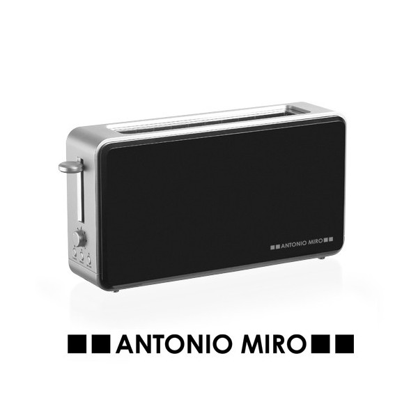 Tostador de Antonio Miró de elegante diseño minimalista en combinación de colores plateado mate y negro brillante. Con funciones tostador con 6 posiciones de potencia, recalentado y descongelado. Bandeja extraíble para migas de pan y presentado en elegante caja individual con logotipo de la marca.