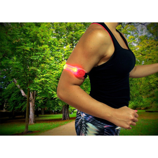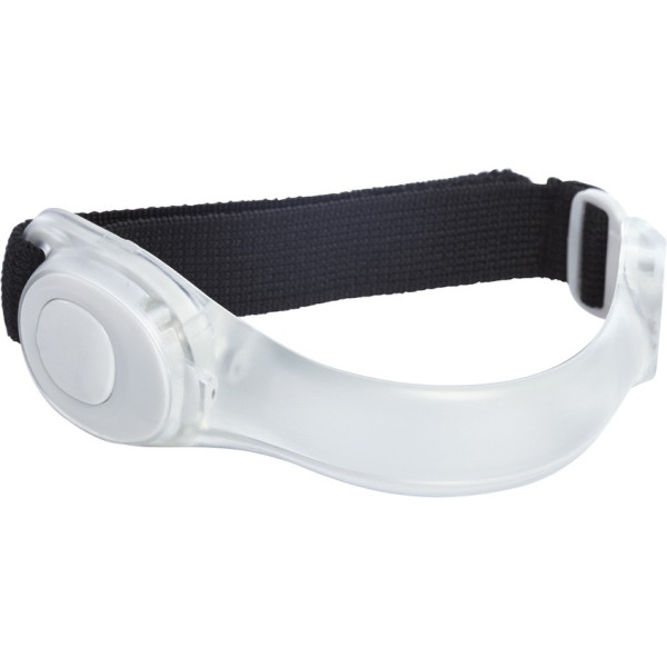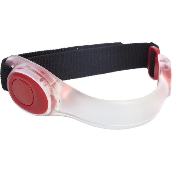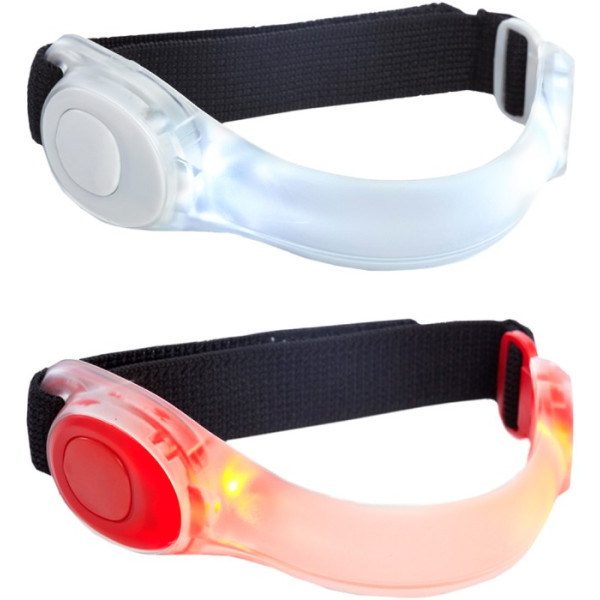 Plástico y polyester. Brazalete ajustable con cierre de velcro y detalle reflejante. 2 luces led que permite 2 formas de alumbrar: fijo/estable y la segunda intermitente. Botón de encendido y apagado.