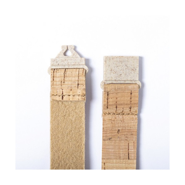 Lanyard de línea nature en corcho natural. Cierre de seguridad en cuello de caña de trigo/PP, para así fomentar la utilización de materias primas naturales y reducir las emisiones contaminantes. Con mosquetón metálico giratorio y disponible en color natural.