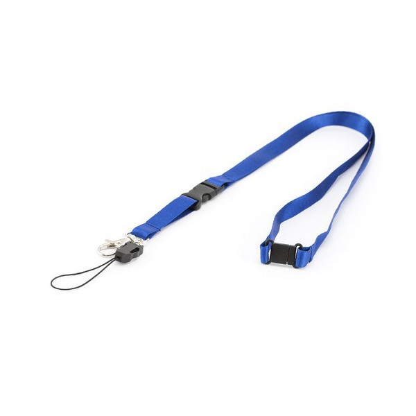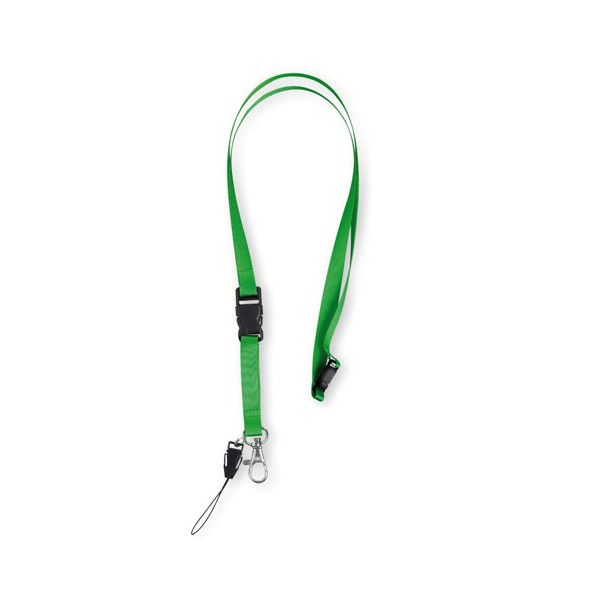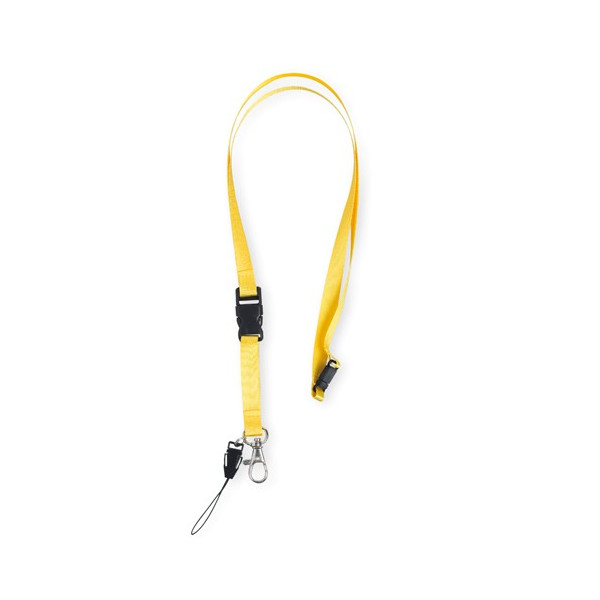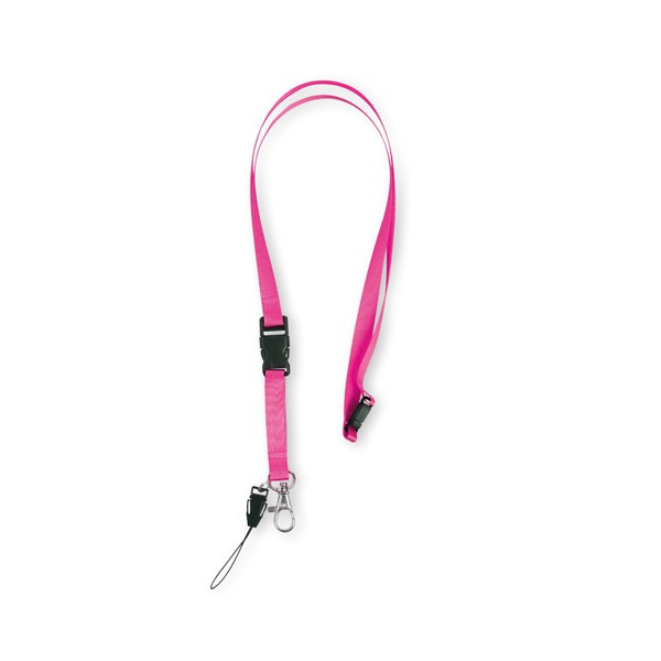 Lanyard en resistente y suave poliéster de variados colores, desmontable con cierre de clip. Con accesorio mosquetón metálico y cinta con cierre de clic.