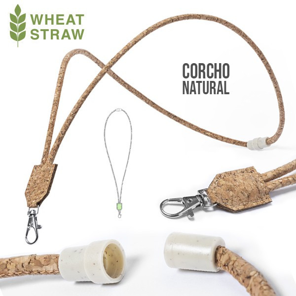 Lanyard de línea nature fabricado en corcho natural de acabado tubular. Con cierre de seguridad para cuello en caña de trigo/PP y mosquetón metálico. Incluye pastilla central en corcho para impresión.