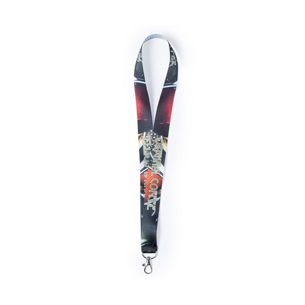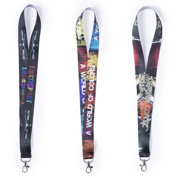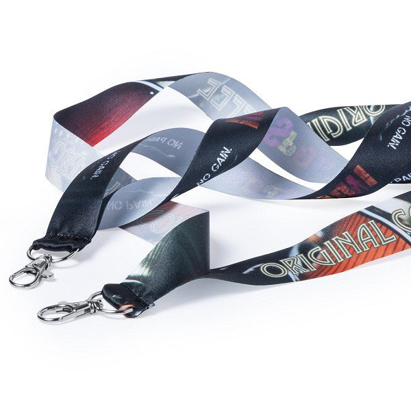 Lanyard con tiras de ancho especial en resistente y suave poliéster con accesorio mosquetón metálico. Especialmente diseñado para personalización total en sublimación para pedidos a partir de 250 piezas.