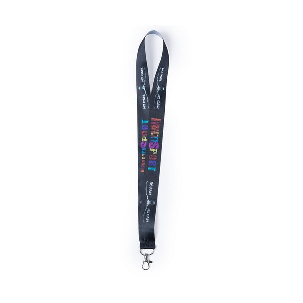 Lanyard de ancho especial en poliéster con mosquetón metálico.