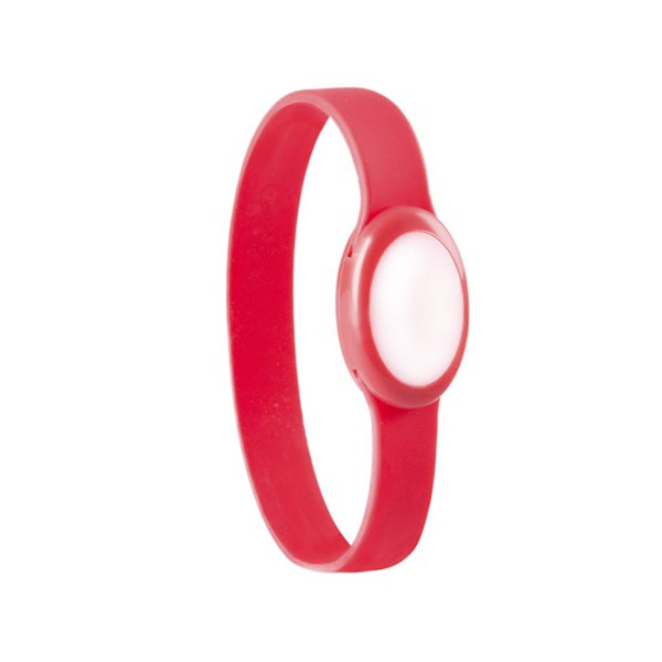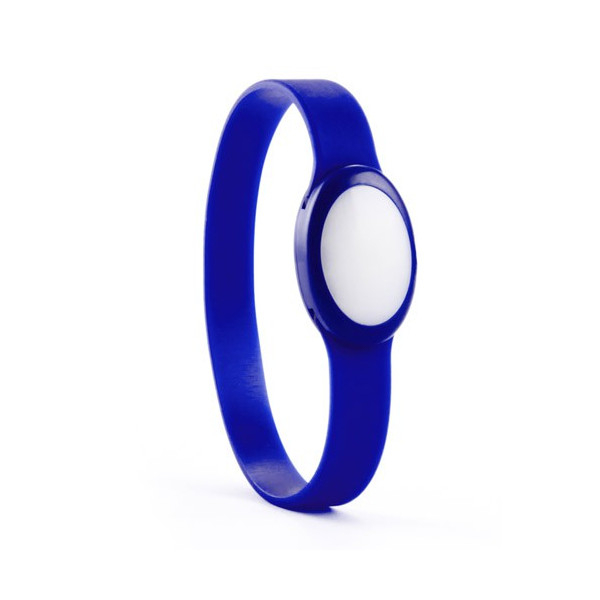 Pulsera led de suave silicona diseñada para actividades deportivas y de ocio. Con luz multicolor y botón de activación. Zona de marcaje blanca para tampografía. Pilas de botón incluidas.