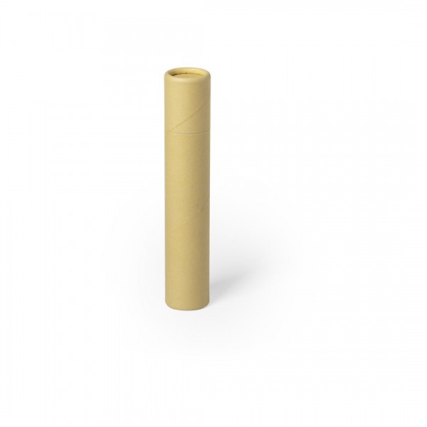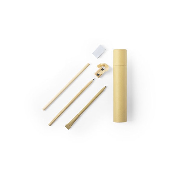 Cuerpo cilíndrico de acabado natural, bolígrafo en cartón, sacapuntas de madera y goma de borrar.