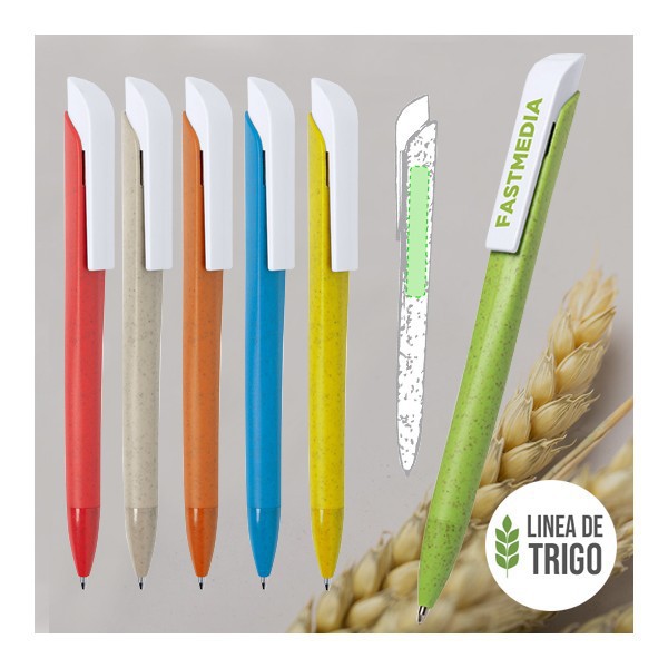 Bolígrafo de línea ECO en caña de trigo, para así fomentar la utilización de materias primas naturales y reducir las emisiones contaminantes.