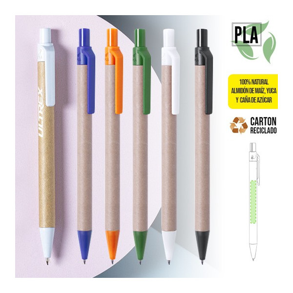 Bolígrafo de línea nature con mecanismo pulsador. Combinación de cuerpo en cartón reciclado de color natural y accesorios en PLA -Ácido PoliLáctico-, que se obtiene a partir de recursos 100% naturales como el almidón de maíz, la yuca o la caña de azúcar, pudiendo convertirse en 100% compostable al final de su ciclo de vida útil. Disponible en variada gama de colores, con tinta azul. Distintivo PLA en parte superior del bolígrafo.