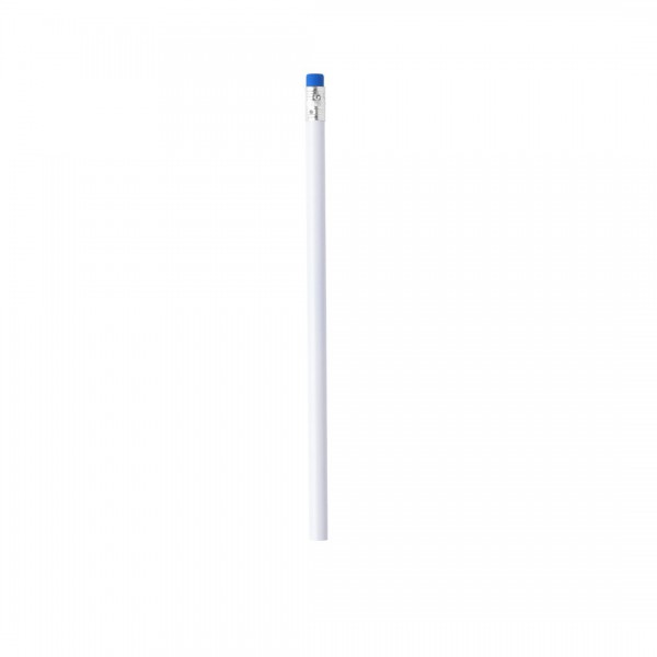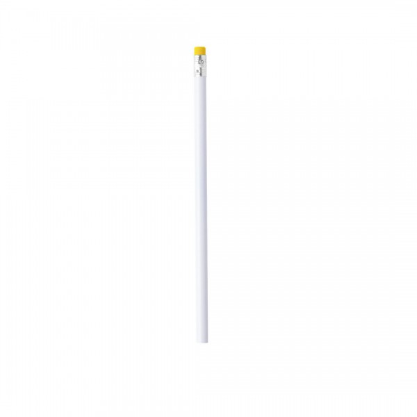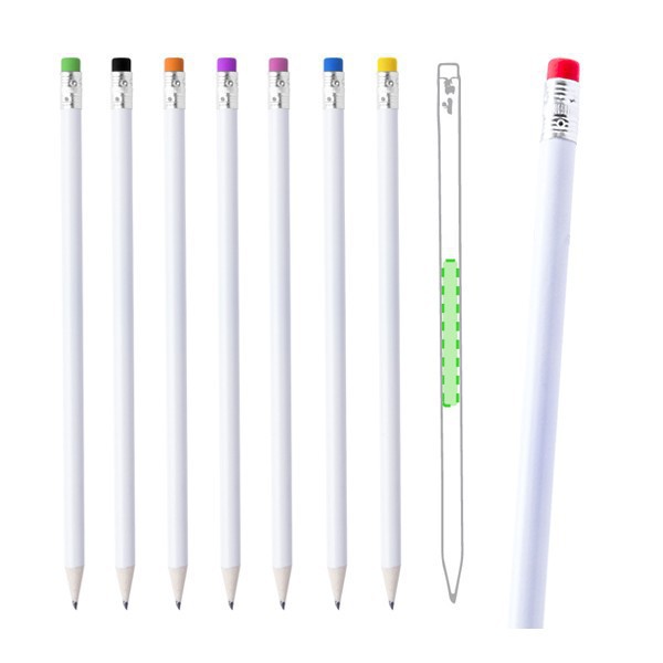 Lápiz con cuerpo acabado en color blanco y goma en variados colores.